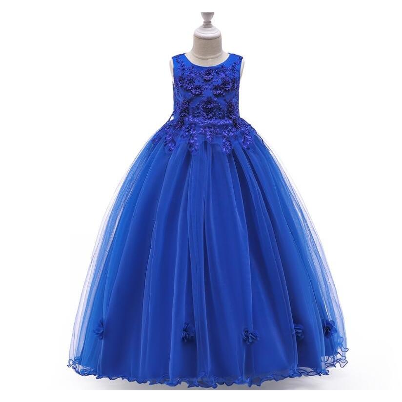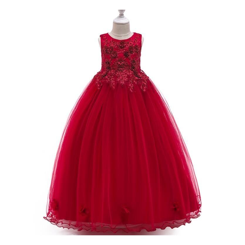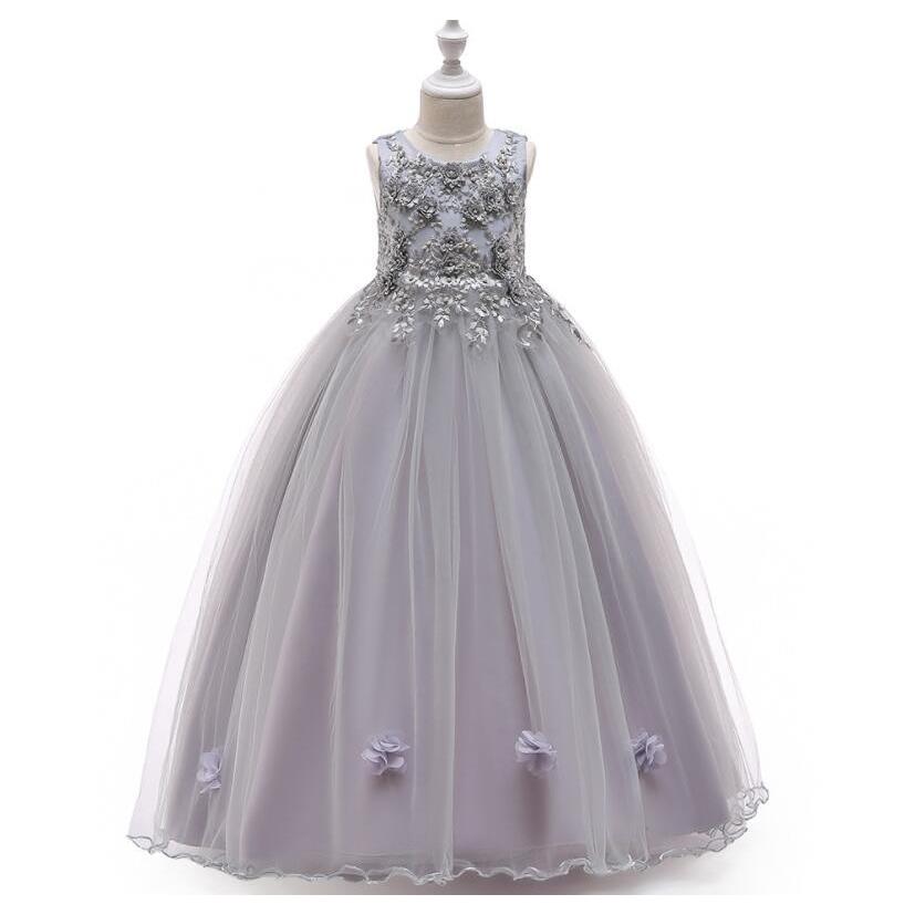胸元の美しい花飾りと刺繍が特徴的なピアノ発表会用キッズドレスです。