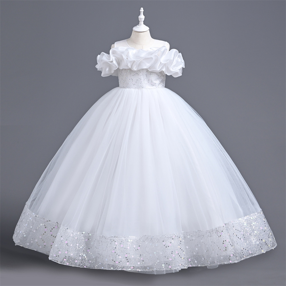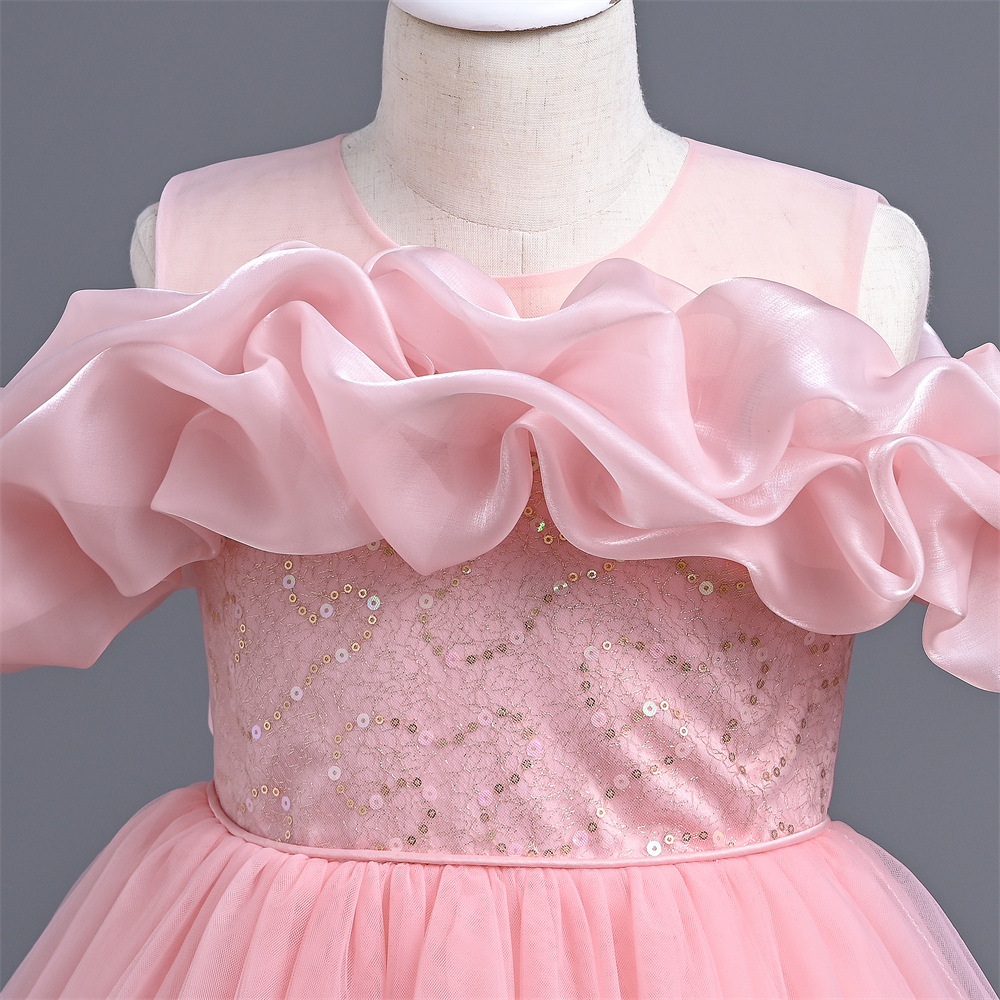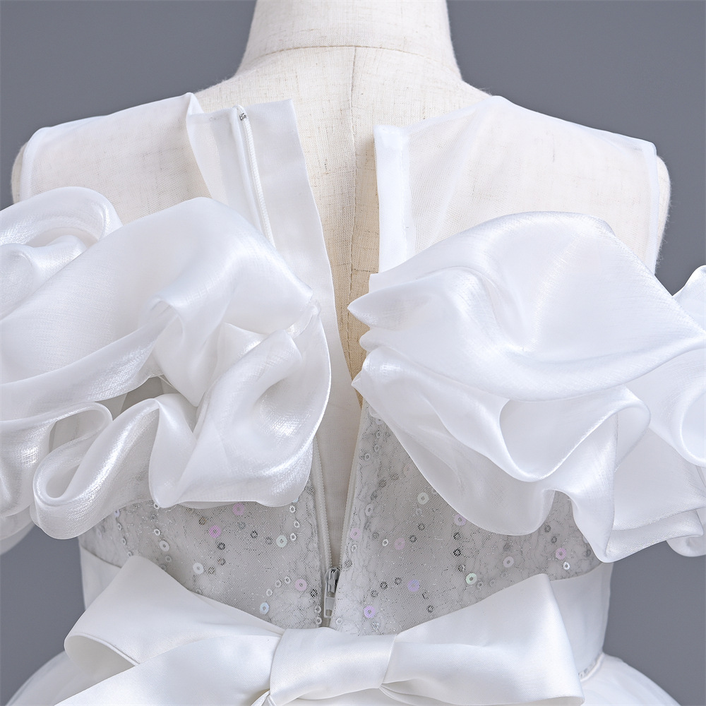 オフショルダーの波打つフリルが顔周りを美しく彩り、優雅で洗練された印象を与えます