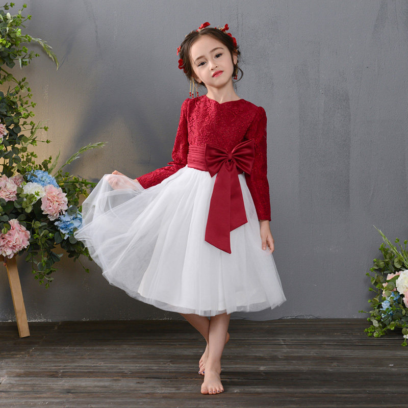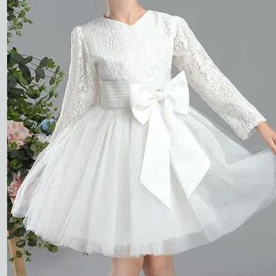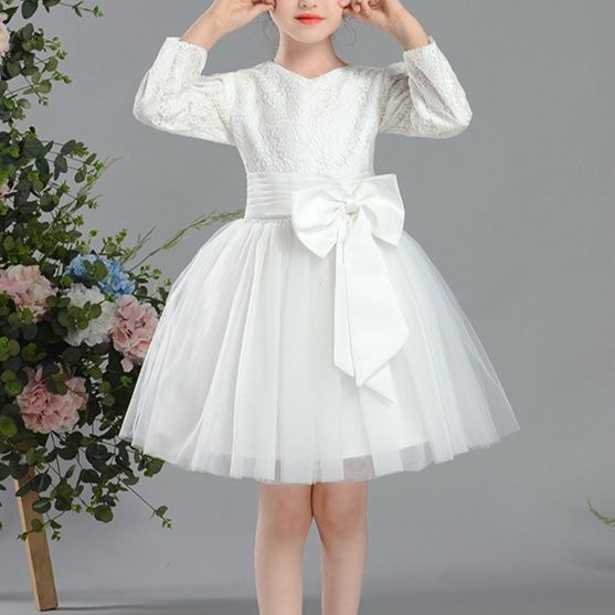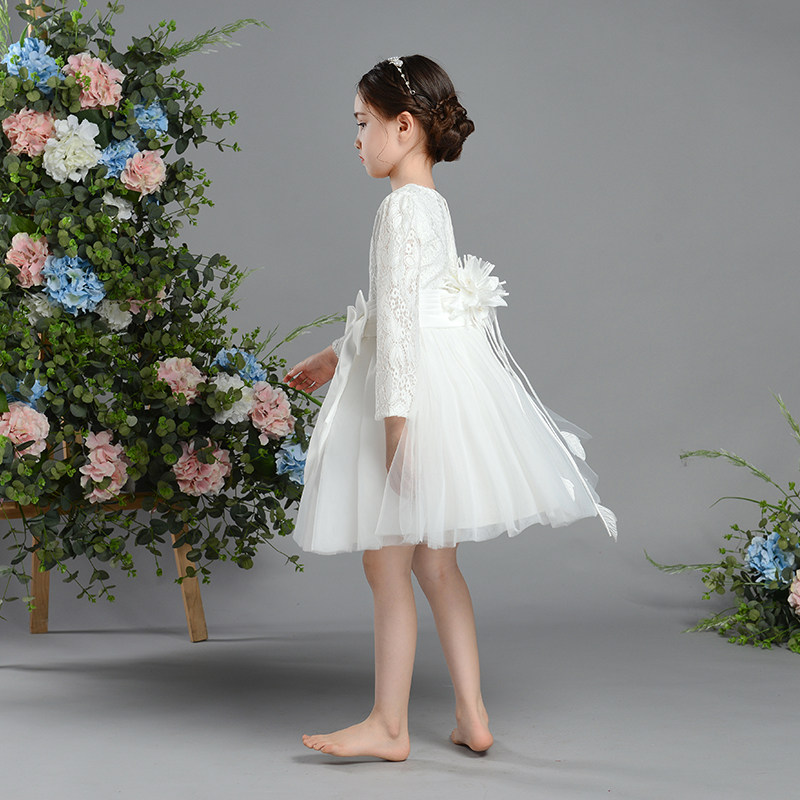 繊細なレース素材の長袖トップスと、ふんわり広がるチュールスカートが組み合わさった上品なピアノ発表会用ドレスです。