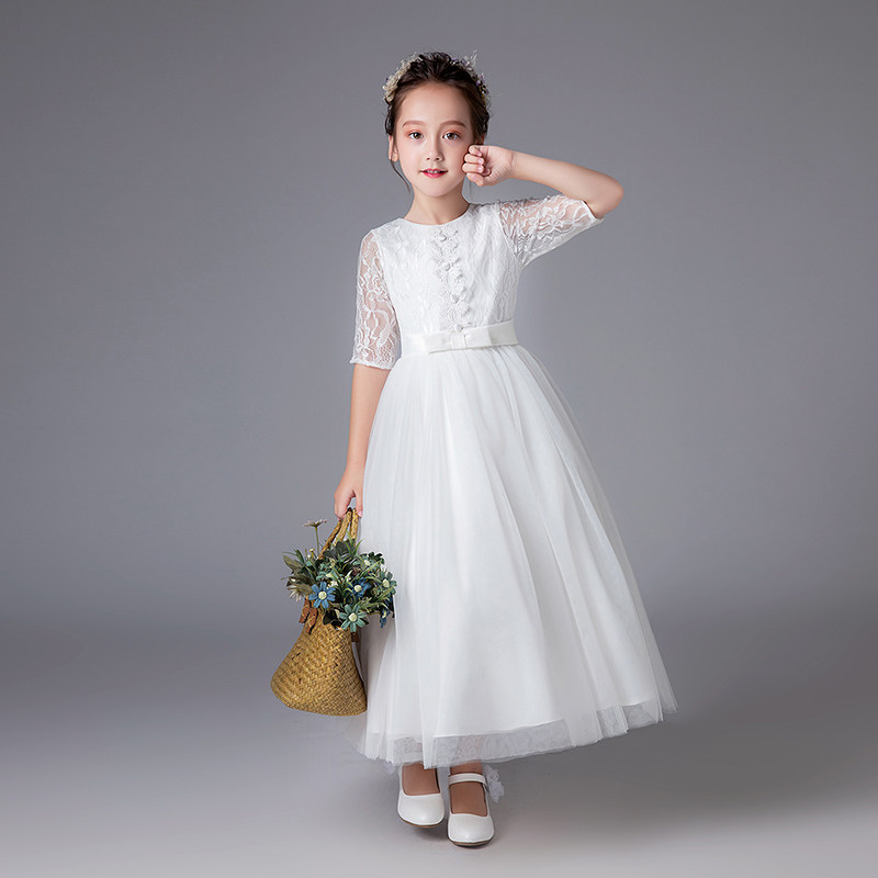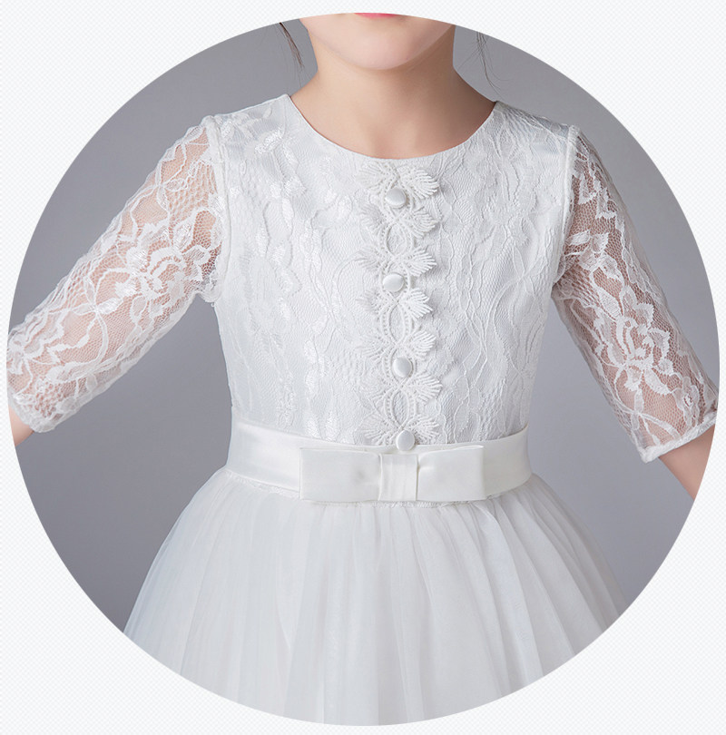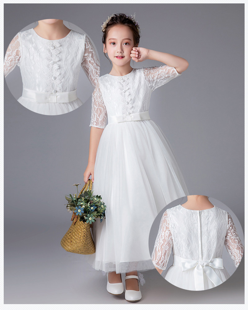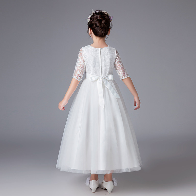 上品なレース素材の五分袖が特徴的なピアノ発表会用ドレスです。