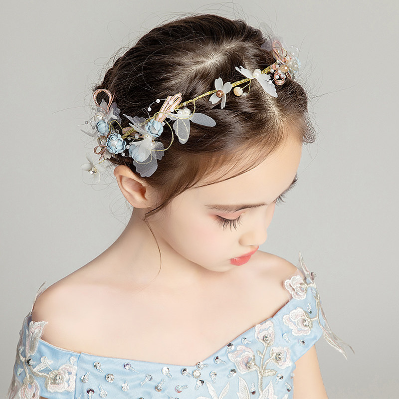 繊細な花々が頭部を優雅に彩り、ピアノ発表会ドレスにぴったりの華やかさを演出します。