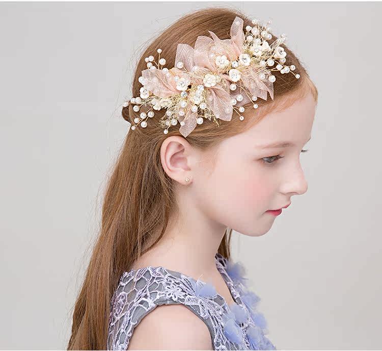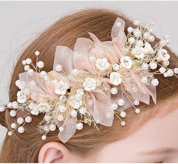 可憐な花びらのモチーフとパールビーズが華やかに輝く髪飾りです。 ピアノ発表会ドレスに合わせやすいエレガントなデザインで、サイドに留めるだけで特別な日の装いが完成します。 柔らかな花びらの立体感と小粒パールの組み合わせが上品な印象を演出します。 アクセサリーとして髪型を選ばず、お子様の晴れ舞台を華やかに彩ります。