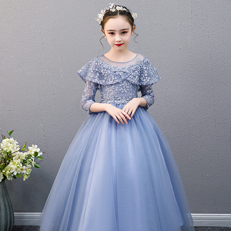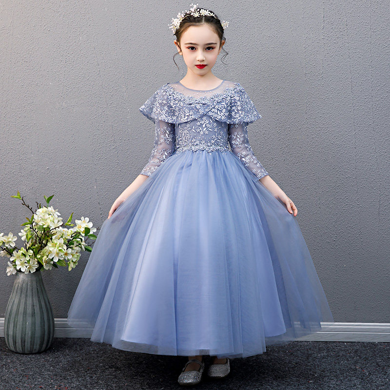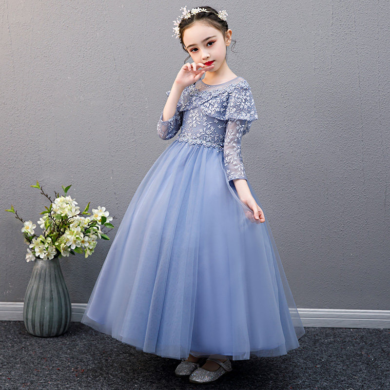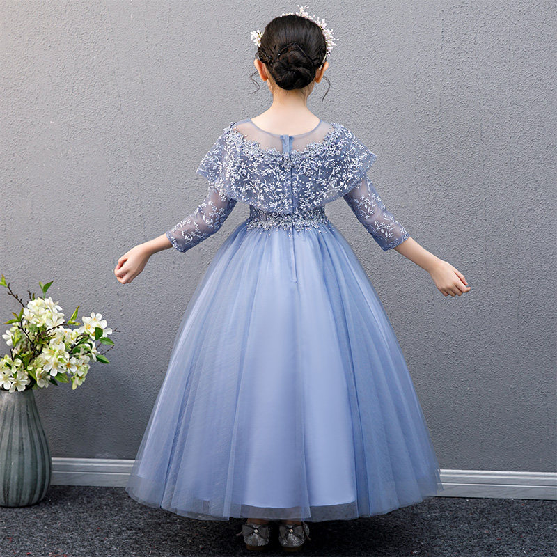 胸元と袖を彩る繊細な花刺繍レースが華やかなピアノ発表会用ドレスです。