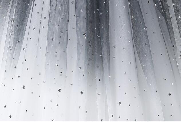 黒から白へのグラデーションチュールに星柄の装飾が散りばめられ、まるで夜空のような幻想的な仕上がり。